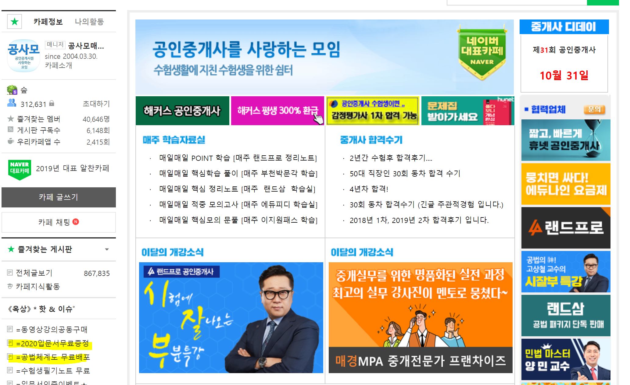 이 카페는 인강업체인 랜ㄷ*프*에서 운영하는 카페인데, 국내 최대규모라서 많은 후기들과 사담이 올라오고 있어요.